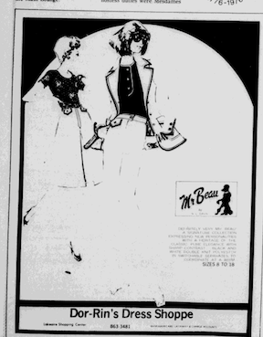 One venture came from the mother-daughter duo, Rin Etter and her daughter Dorothy Mills. Rin had her shop, Rin’s Dress Shoppe, on the square for years before the two started Dor-Rin’s Dress Shoppe on Williams Drive in 1974.